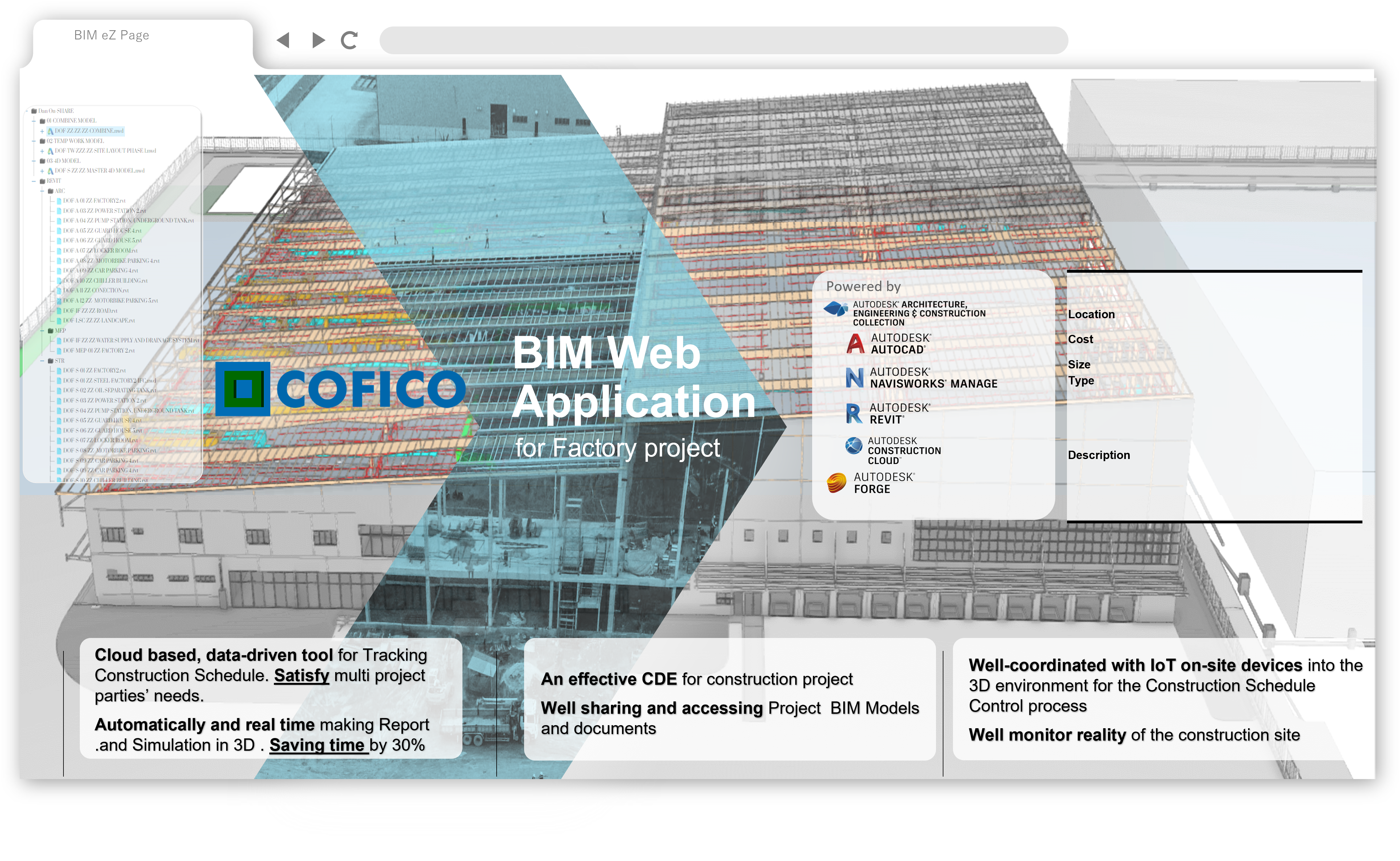 BIM EZ – BIM Web Application BIM system based on technologies: 3D, Data, Website, Cloud computing. The System was named BIM EZ that has meaning “Easy” and Its aimed at supporting the customers and civil engineer. By using the BIMEZ, they can maximizing the exploitation and using BIM models conveniently and automatically.